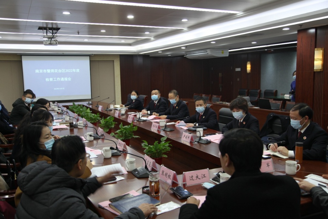 会议首先播放了检察机关打击惩治养老诈骗犯罪,服务代表履职和知识产权保护的专题宣传片。而后,南京市检察院副检察长程序通报了2022年全市检察工作情况,雨花台区检察院党组书记、检察长肖水金通报了2022年雨花台区检察院工作情况。